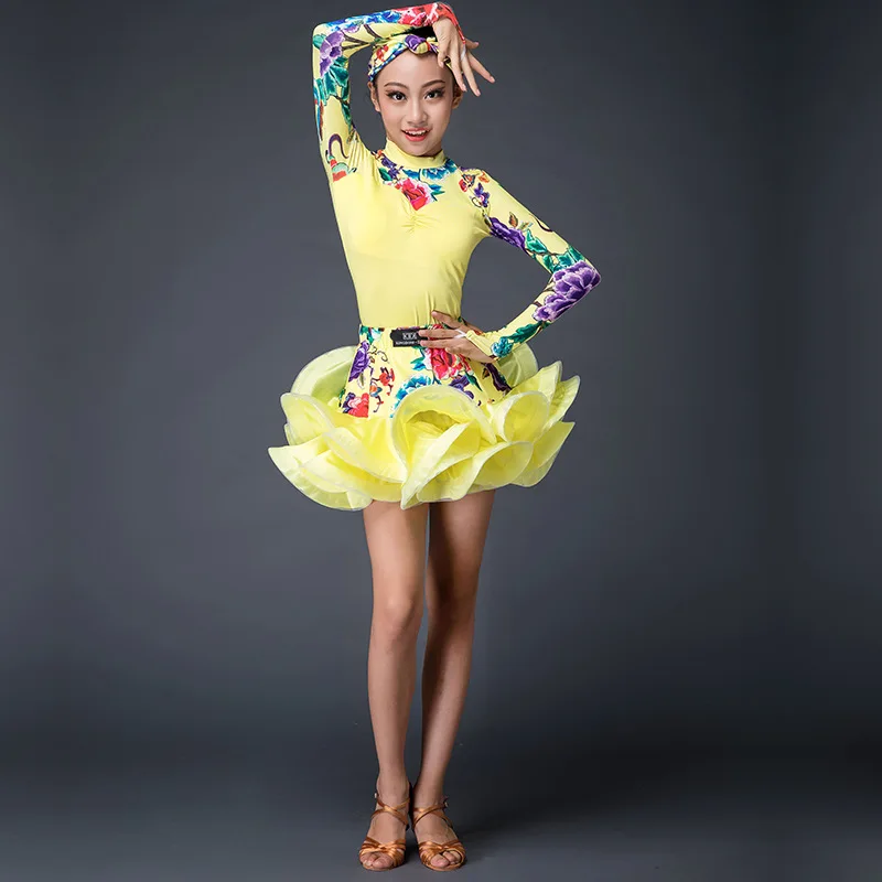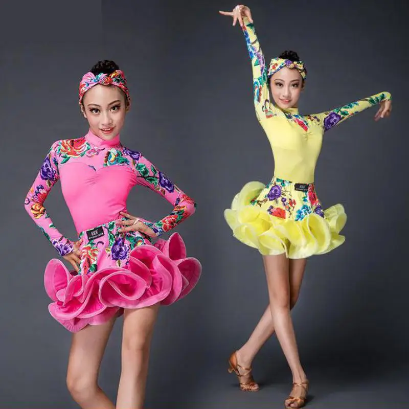 Best Quality Girls Latin Dance Dress Children Long Sleeve Dance Leotard Skirt Sets Performance Competition Stand